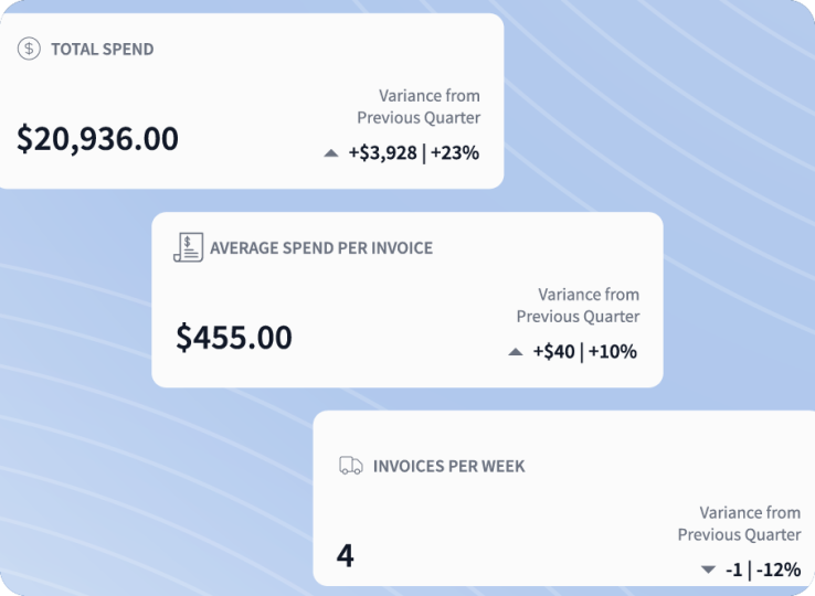Track how your total spend, average invoice size, and deliveries change over time with seven interactive widgets for regulated and non-regulated invoices. For example, compare weekly spend or see which product categories and top vendors drive the biggest shifts in your costs.